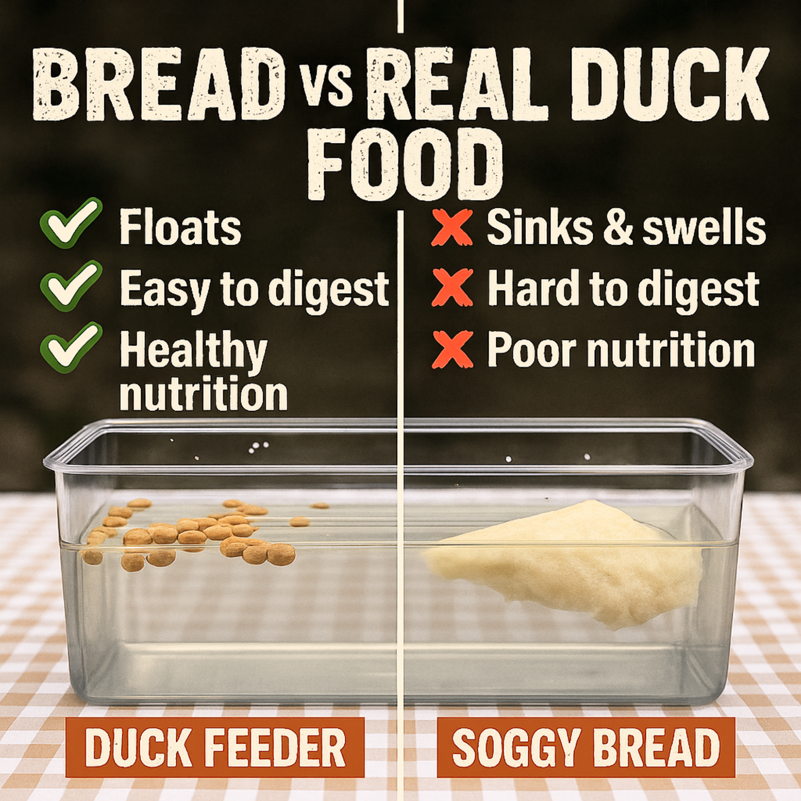 Bread tends to sink and swell, offers poor nutrition, and is harder to digest. DuckFeeder is real duck food made for ducks.