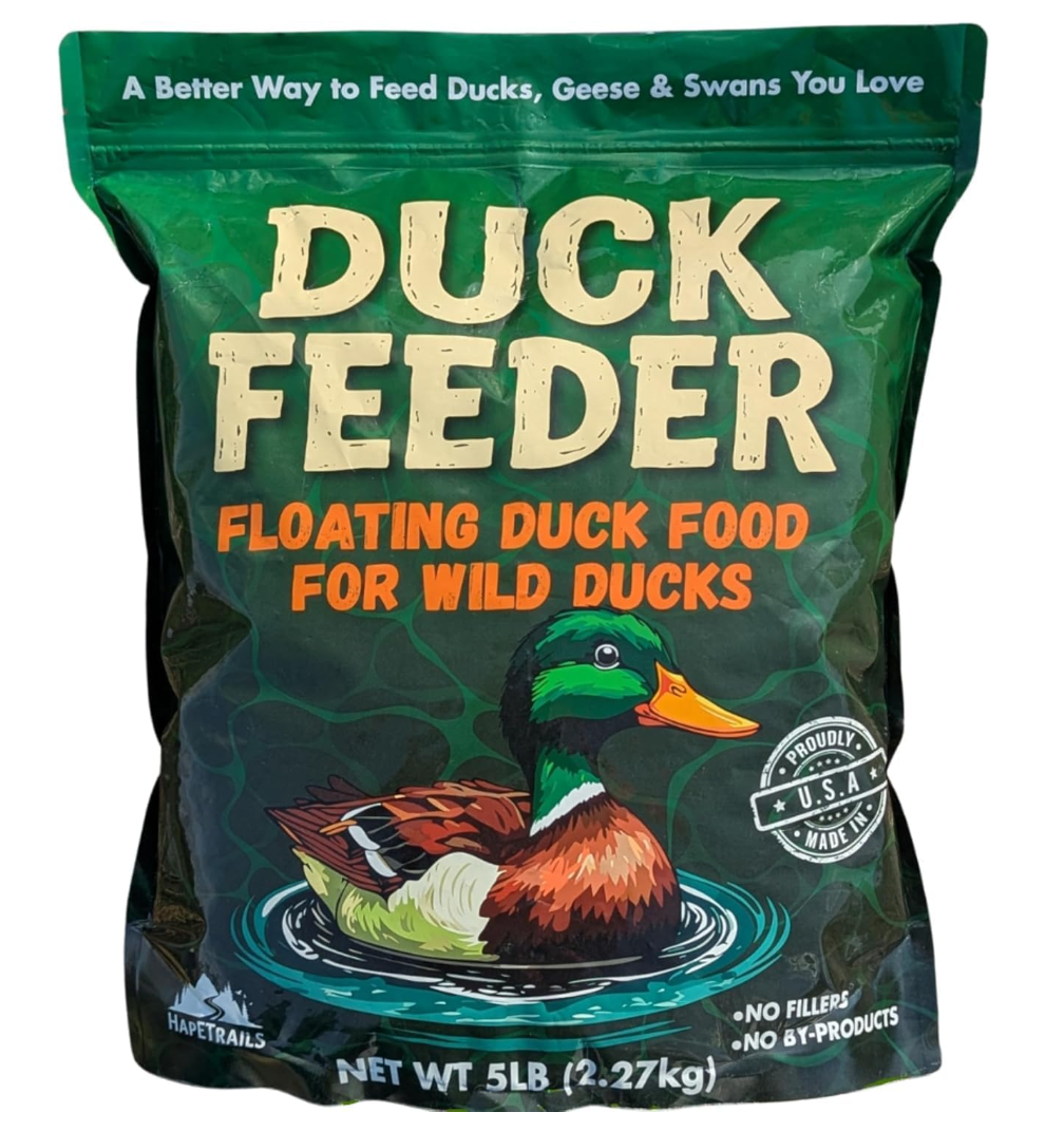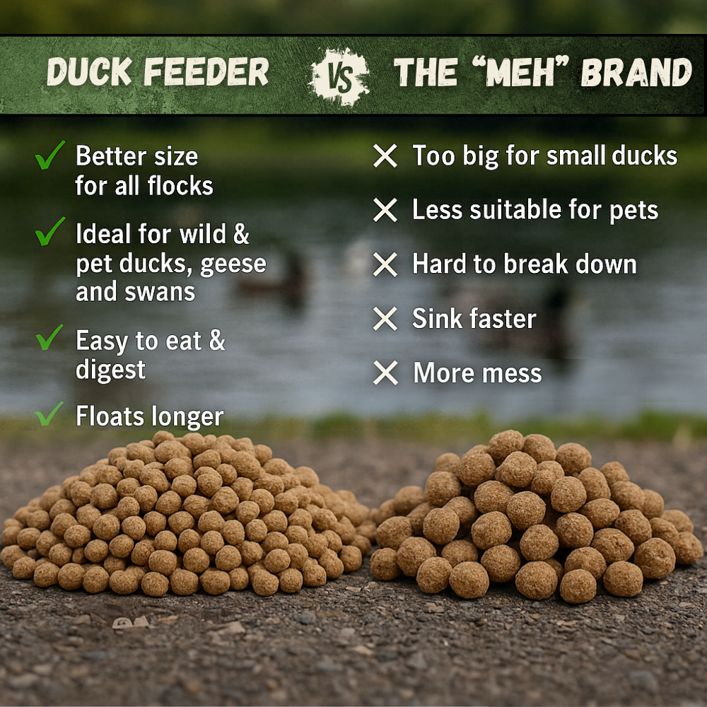 DuckFeeder is formulated to be easier to break down and float longer than many “big pellet” feeds—helping reduce leftover sinkers and shoreline mess.
